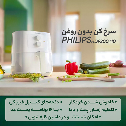 غذاهای فست فود غذاهای سرخ کردنی بسیار خوش مزه هستند و طرفدار های زیادی دارند اما به دلیل مصرف خیلی بالا روغن در پخت این دست از غذاها چندان سالم نیستند و علاوه بر آن صرفه اقتصادی هم ندارند. سری جدید سرخ کن های فیلیپس که با نام VIVA معرفی کرده تنها ما مقدار خیلی کمی از روغن کیفیتی دقیقا مشابه با سرخ کن های قدیمی ارائه می دهد اما سالم تر. یکی از این سرخ کن ها مدل HD9200 می باشد که تا 80 درصد در مصرف روغن صرفه جویی می کند. سرخ کن فیلیپس مدل 9200 یکی از سرخ کن های حرفه ای و باکیفیت شرکت معتبر فیلیپس است. سرخ کن 9200 فیلیپس قابلیت پخت سییب زمینی، اسنک، مرغ، جوجه، همبرگر، سوسیس، گوشت، ماهی، کیک،مافین، نان تست، سبزیجات و … را دارا می باشد.زمان و دمای پخت سرخ کن فیلیپس مدل HD9200 کاملا قابل تنظیم می باشد. تایمر یکپارچه به شما امکان می دهد تا زمان پخت را تا 60 دقیقه تنظیم کنید همچنین این دستگاه عملکرد خاموشی خودکار نیز دارد که پس از آن با صدایی به شما اطلاع می دهد که غذایتان آماده است. سرخ کن فیلیپس مدل HD9200 امکان تنظیم کردن درجه حارت تا 200 درجه را فراهم کرده است.این سرخ کن از نوع سرخ کن های کم روغن و بدون روغن است که از توان مصرفی 1400 وات است. ظرفیت کاسه سرخ کن فیلیپس مدل HD9200 معادل 0٫8 کیلوگرم است و برای 4 نفر مناسب است.